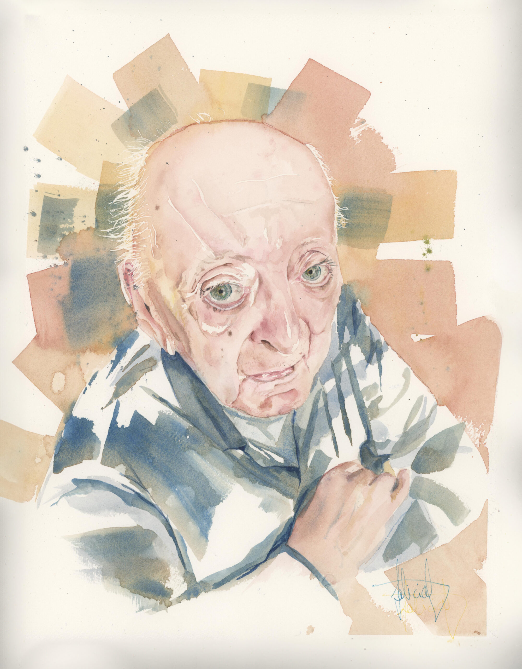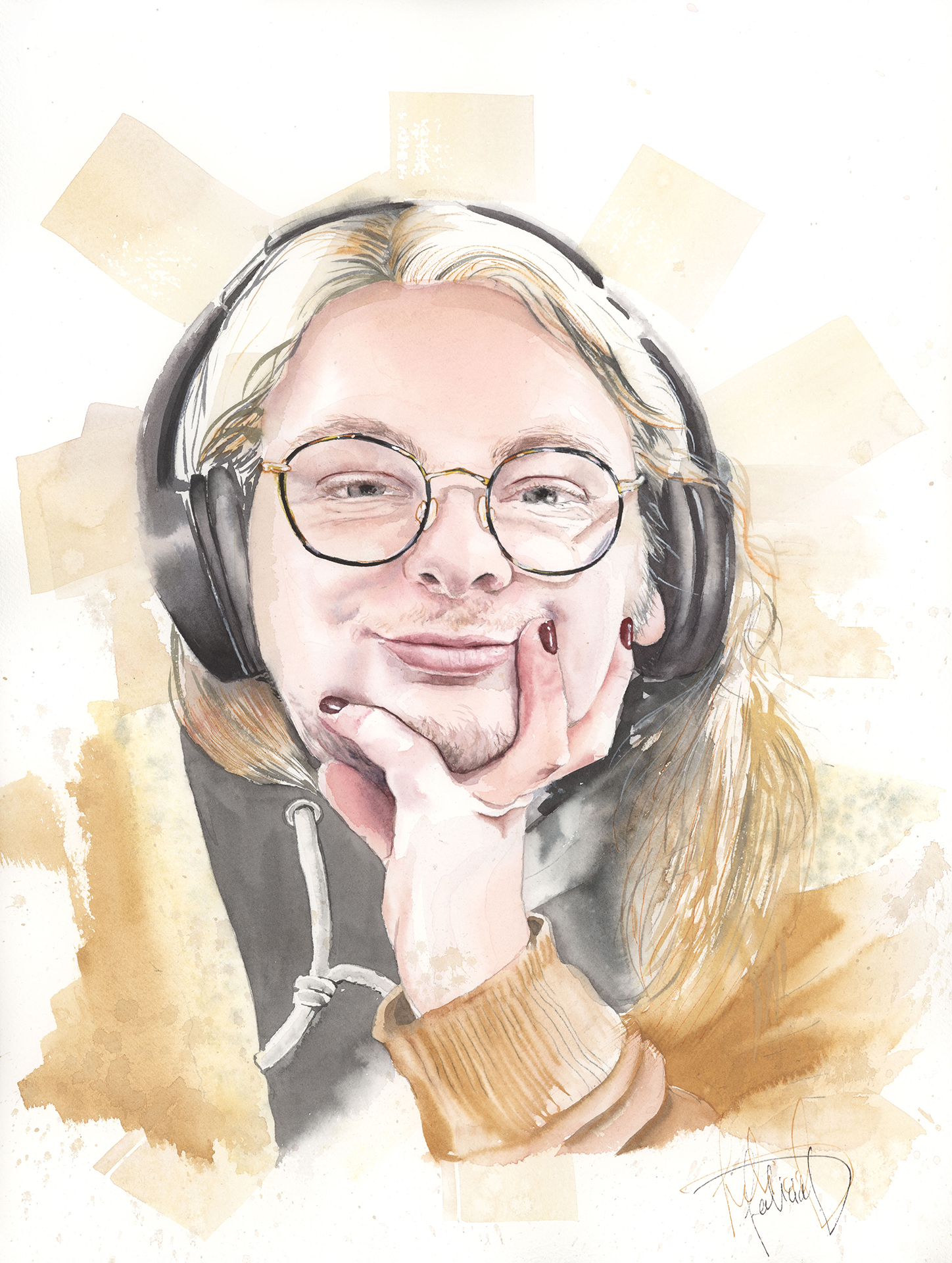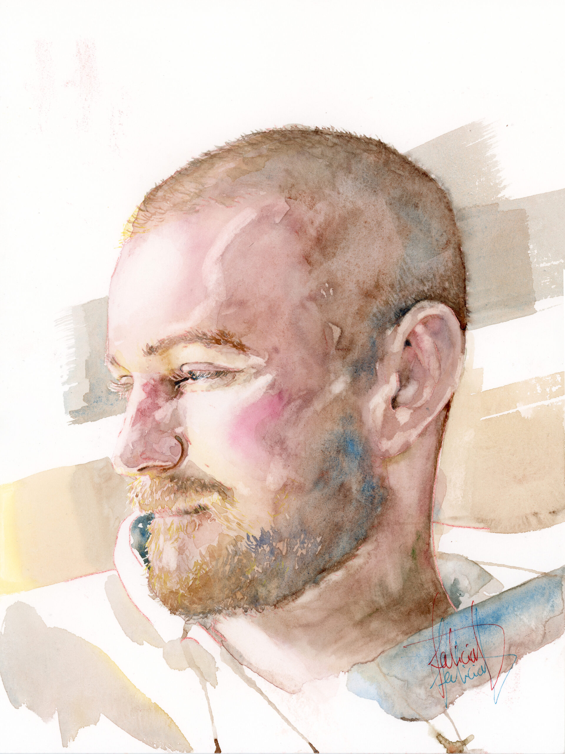Le portrait est interprété sur papier aquarelle 100 % coton 30×40 cm, avec les pigments extra-fins Winsor & Newton, pour une tenue et une profondeur incomparables.