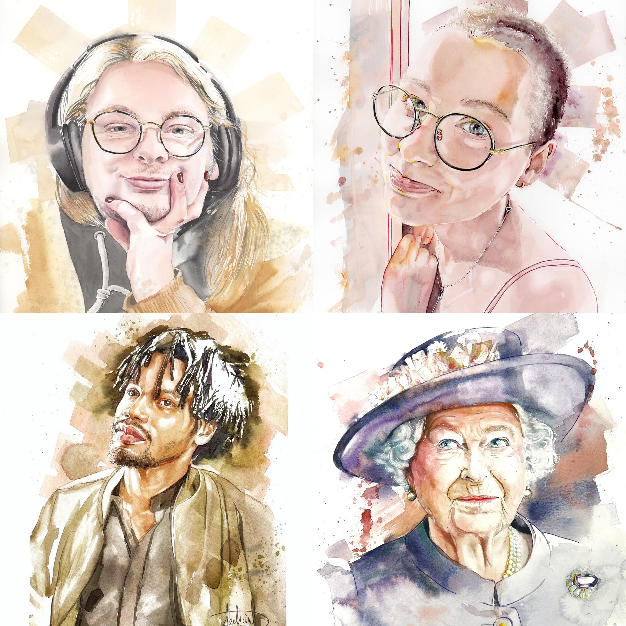 Réalisés sur papier Arches, avec les couleurs extra-fines Winsor & Newton, ces portraits allient finesse, profondeur et pérennité. Leur éclat se maintient au fil des années.